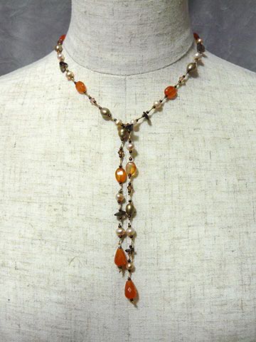 カーネリアン、スモーキークォーツ、淡水パール、スワロフスキー、ビーズの綺麗なネックレスです。